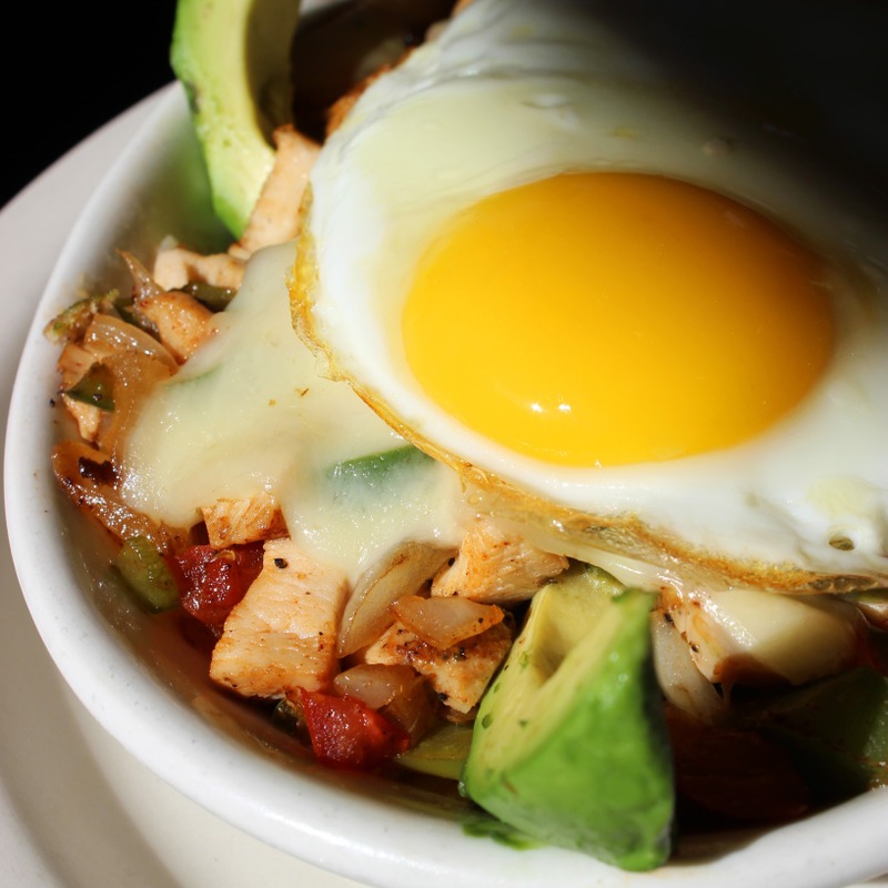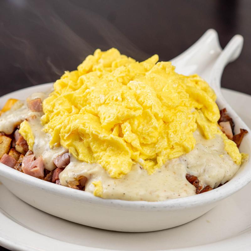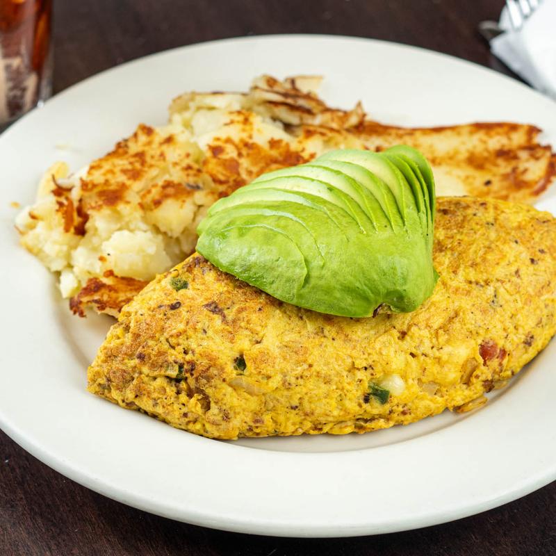 All omelets & skillets are made with farm-fresh eggs and served with golden brown potatoes and your choice of toast or buttermilk pancakes | Only one substitution for ingredients | Fresh fruit instead of potatoes +$2.99