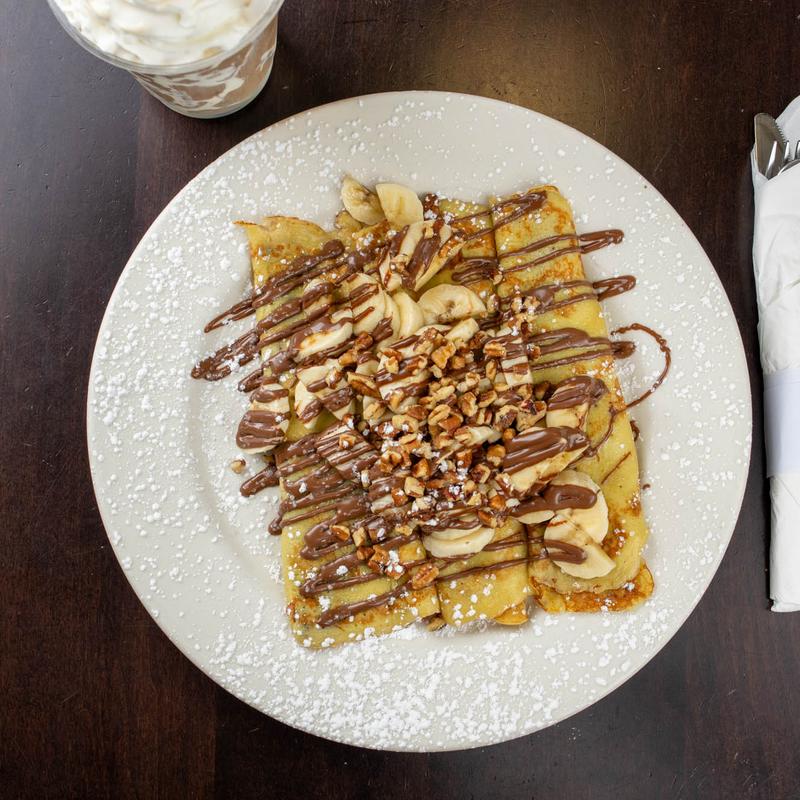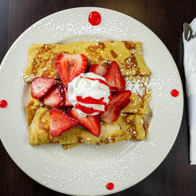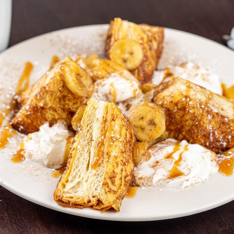 Served a La Carte | Made daily from scratch | French toast is dusted with powdered sugar and served with warm maple syrup. Whipped cream is available upon request. All stuffed French toasts are stuffed with our signature made in-house honey vanilla cream cheese • Regular cream cheese available upon request +$1.99 | Add a side of hickory smoked ham, bacon, or jumbo sausage links for +$5.49